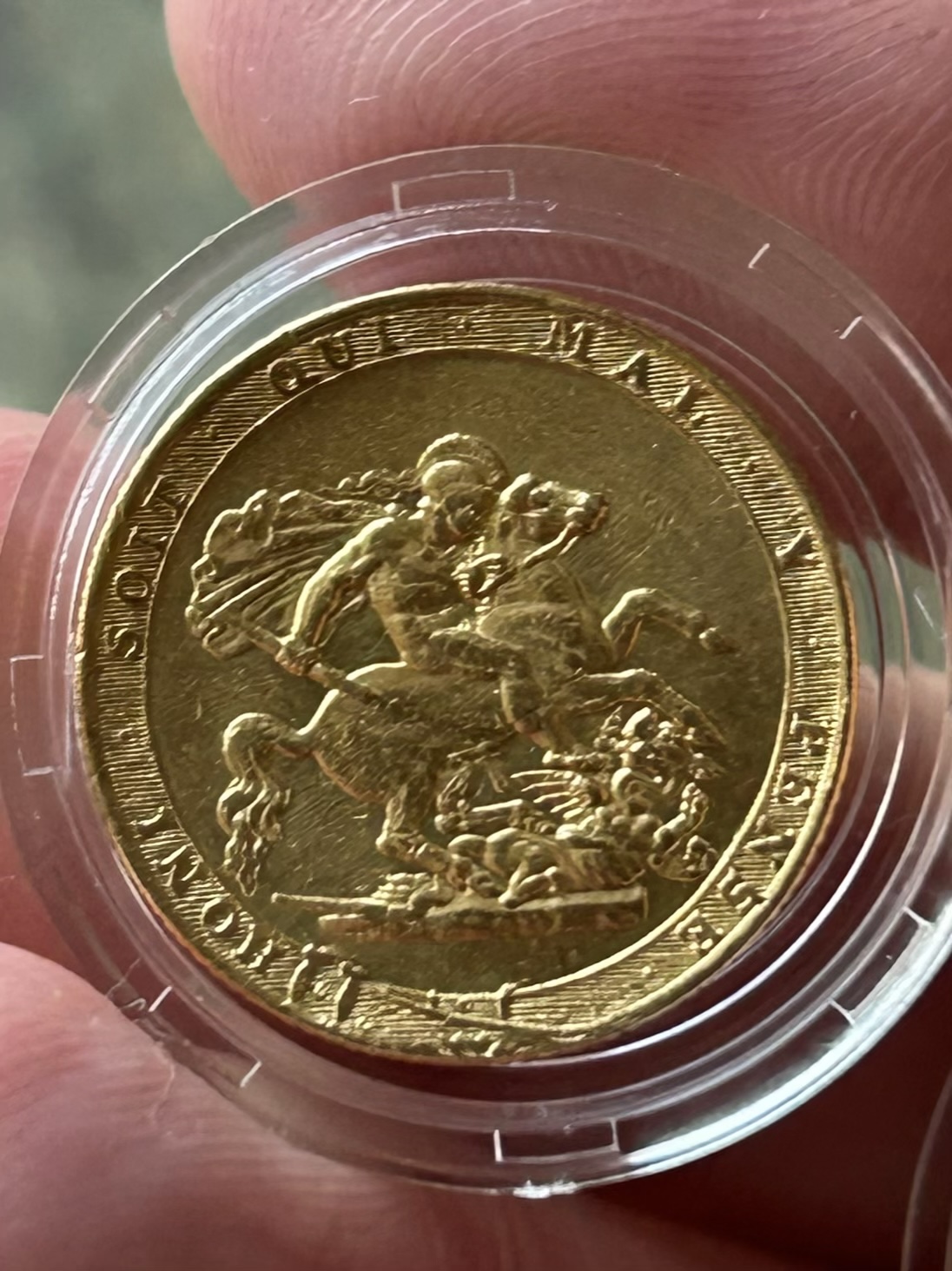 The coins were struck in the new Royal Mint building on Tower Hill with steam powered presses supplied by Messrs Boulton, Watt and Rennie. The reverse design of St. George and the dragon was developed by Benedetto Pistrucci.