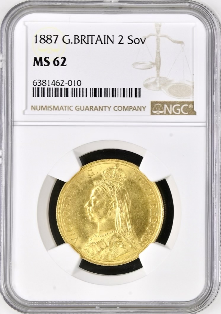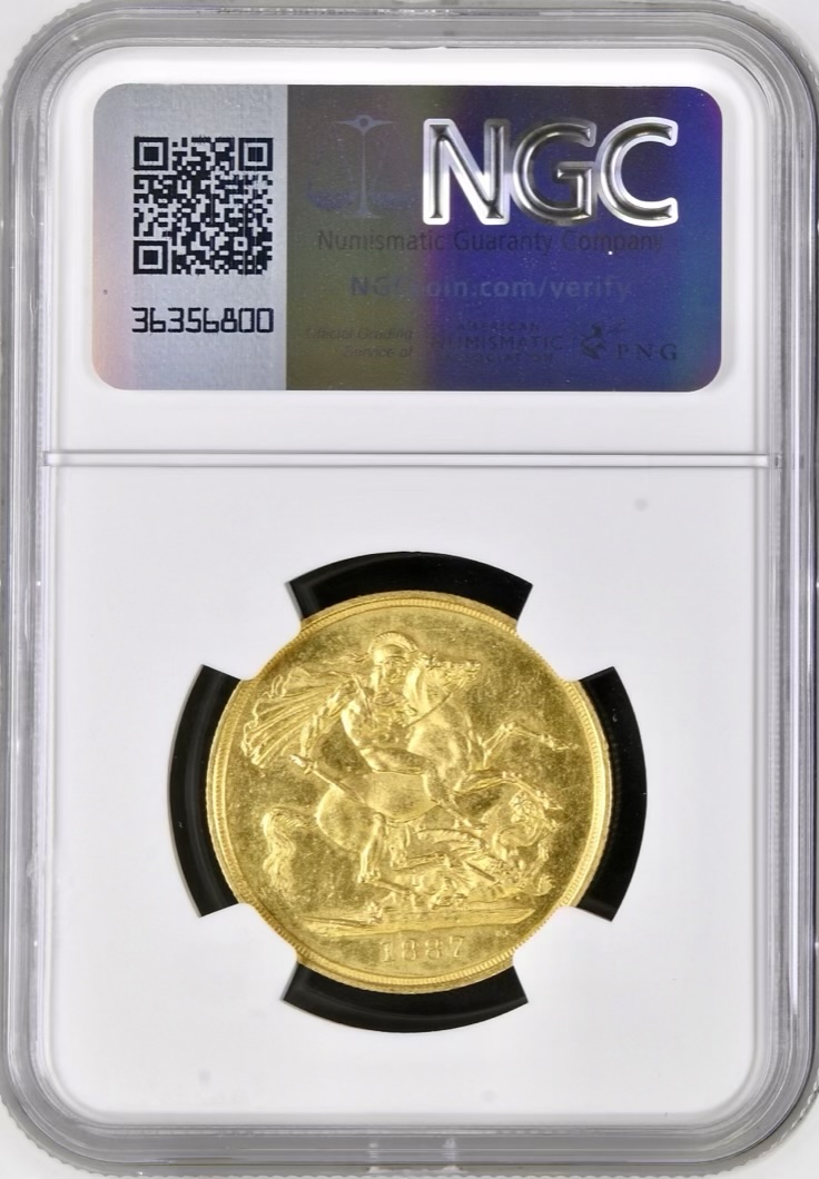Reverse: St. George on horseback holding a short sword in his right hand, the horse rearing to right over a fallen dragon which has a broken lance in its chest; in exergue, the date, 1887 and the artist's initials B.P.; the mint mark (if any) is in the ground above the middle of the date.