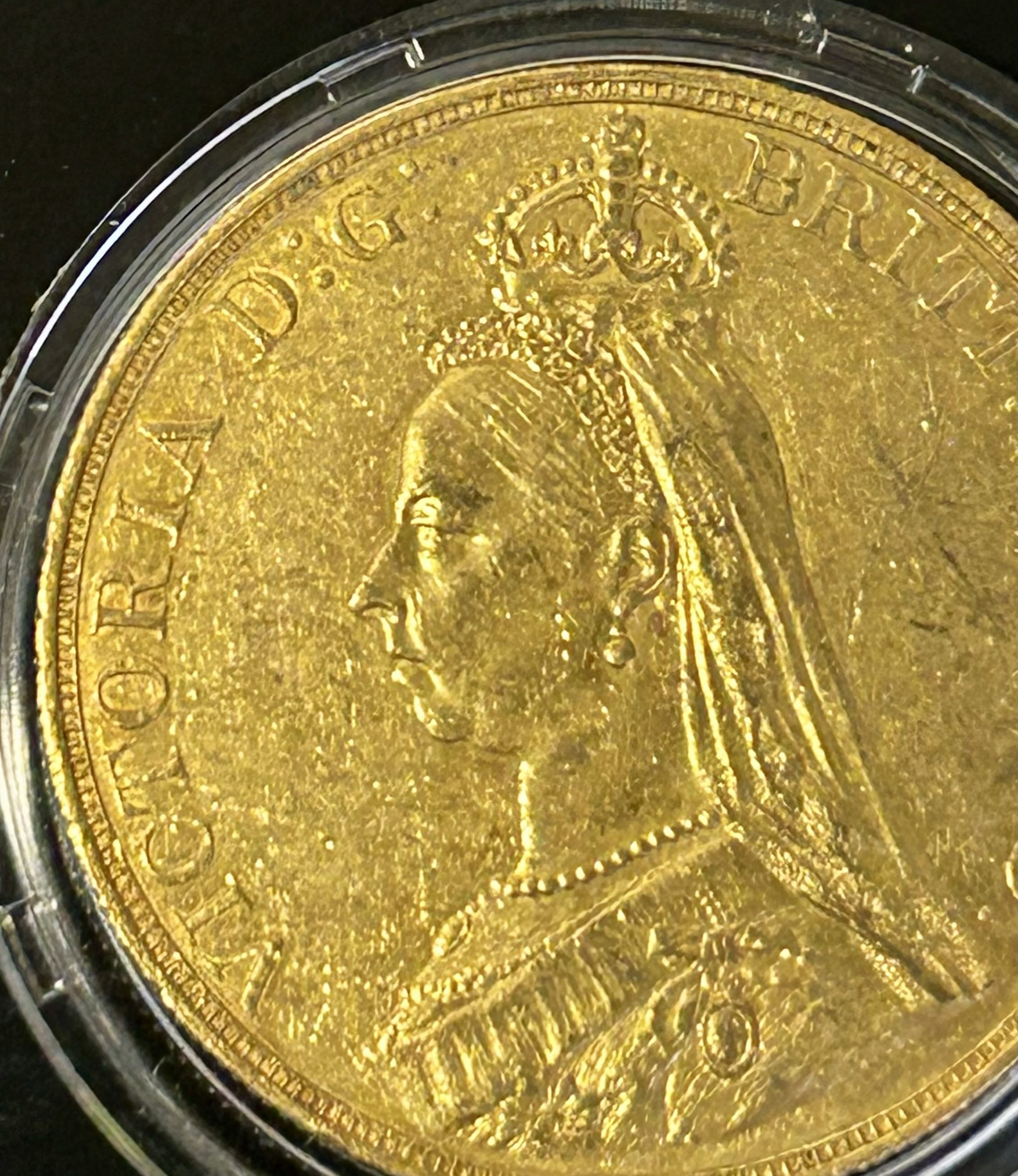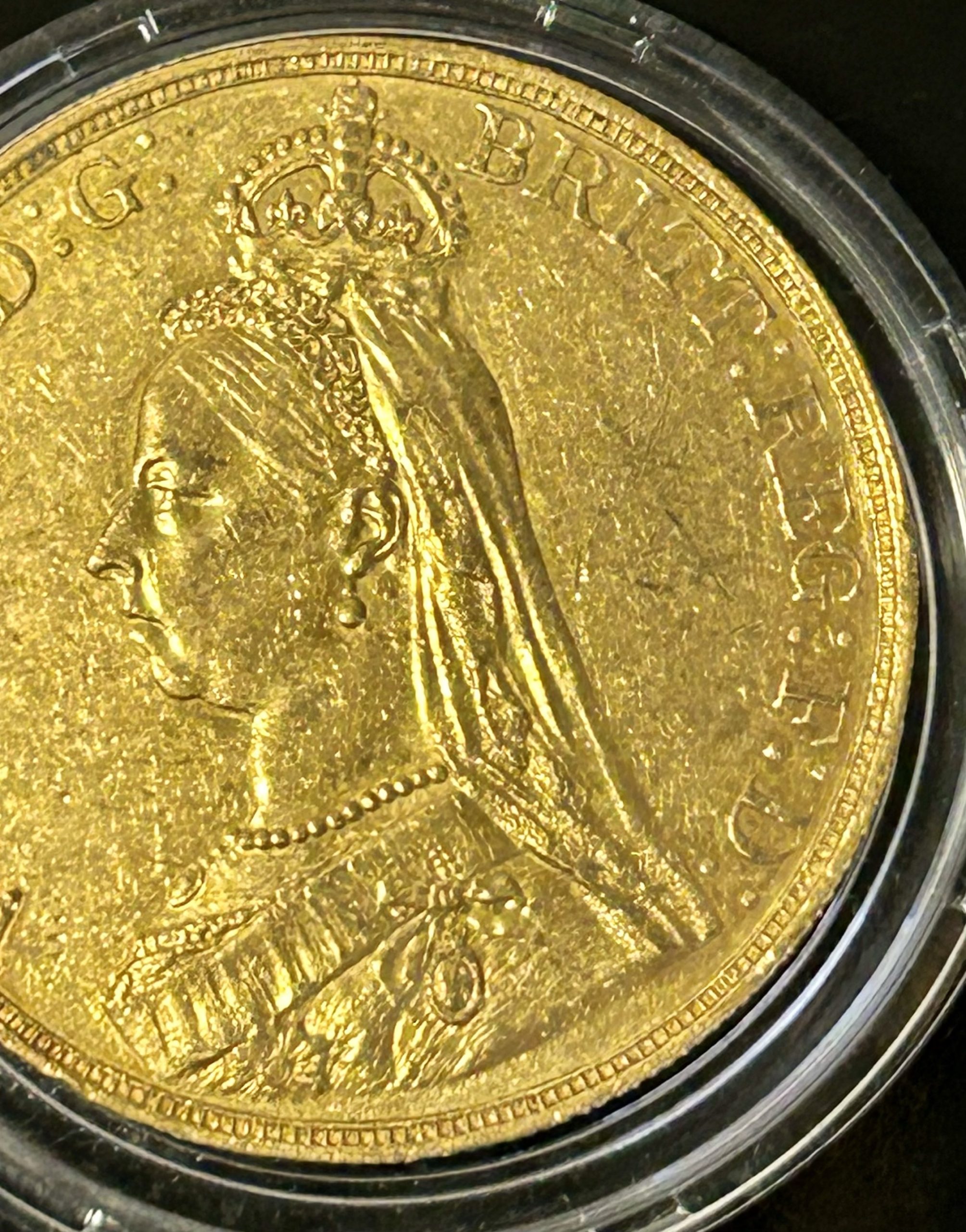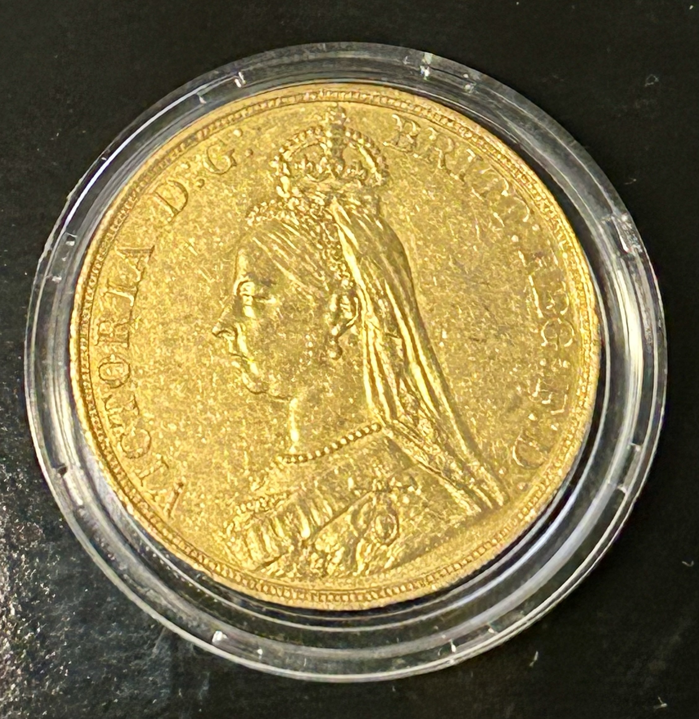 A gold coin (36 mm diameter with milled edge) featuring the Jubilee bust of Queen Victoria wearing imperial crown and facing left, a long veil falls behind the head, the bust is draped and decorated with the Star of the Garter, and also the badge of the Imperial Order of the Crown of India; around, VICTORIA D:G: BRITT: REG: F:D: , the artist's initials J.E.B. below the shoulder.