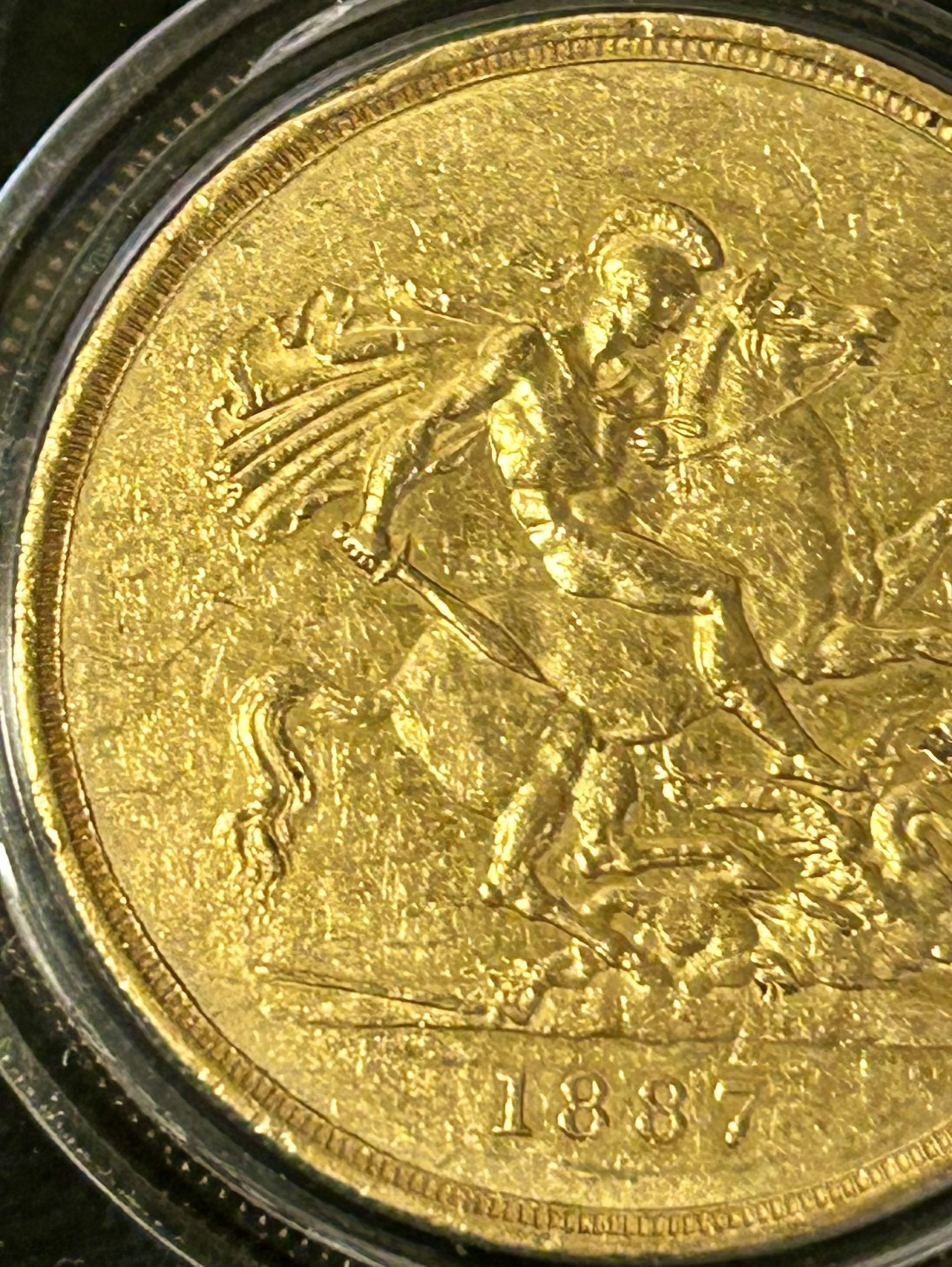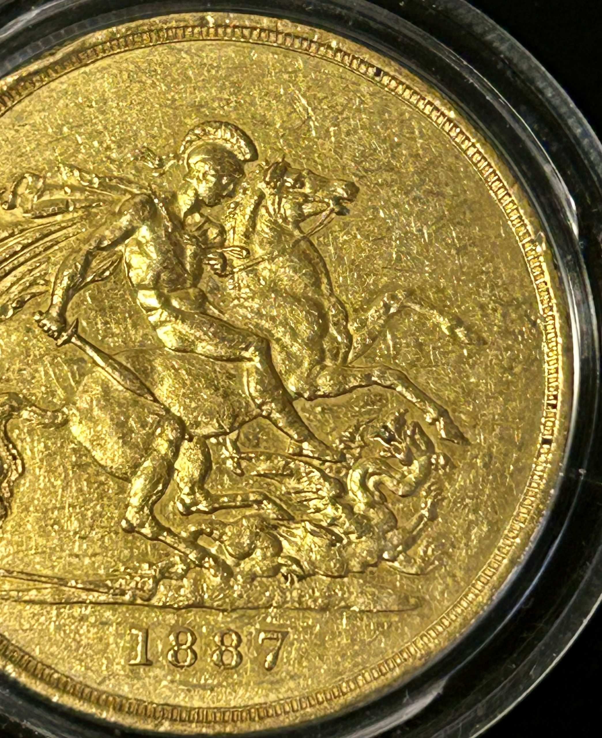Reverse: St. George on horseback holding a short sword in his right hand, the horse rearing to right over a fallen dragon which has a broken lance in its chest; in exergue, the date, 1887 and the artist's initials B.P. (for Benedetto Pistrucci); the mint mark (if any) is in the ground above the middle of the date.