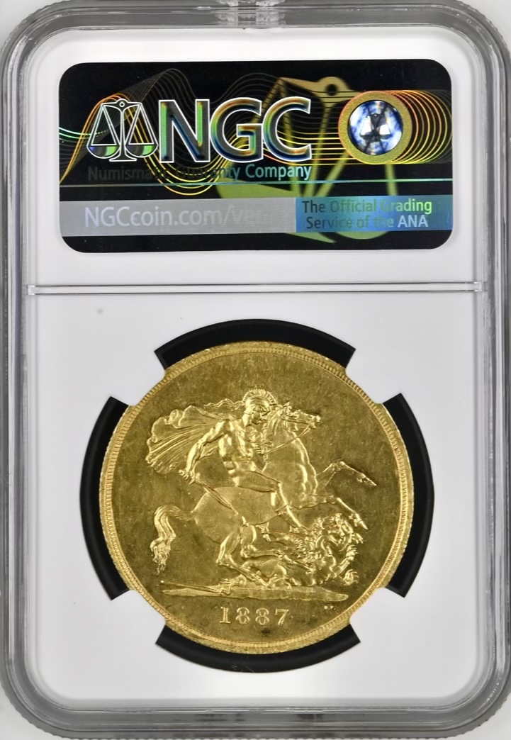 Reverse: St. George on horseback holding a short sword in his right hand, the horse rearing to right over a fallen dragon which has a broken lance in its chest; in exergue, the date, 1887 and the artist's initials B.P. (for Benedetto Pistrucci); the mint mark (if any) is in the ground above the middle of the date.