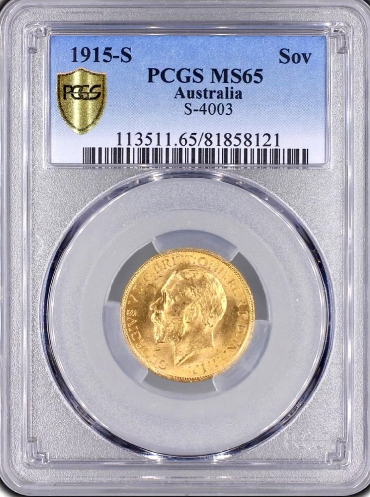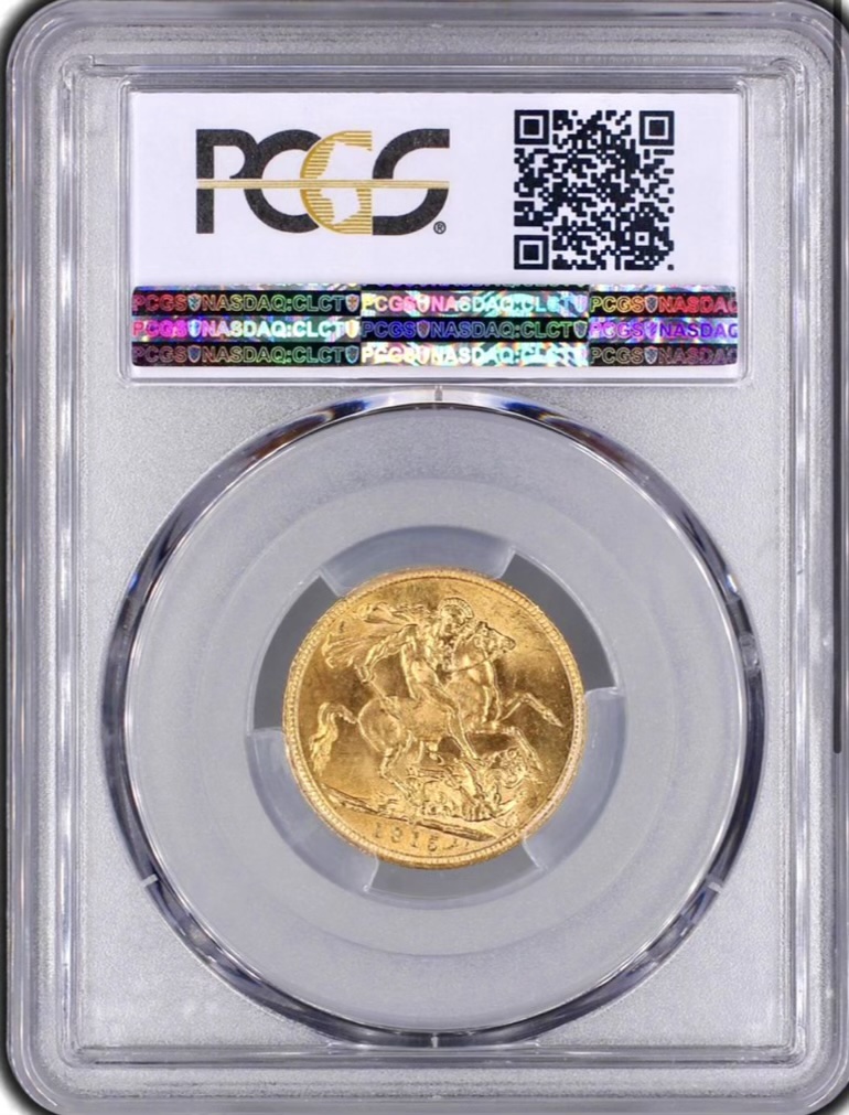 St George on horseback holding short sword and wearing a helmet, cape and boots, the horse rearing over dragon whose side is pierced by a broken lance, the haft of the lance is on the ground behind the horse; the date, 1915 and artist's initials B.P. in exergue; the mint mark (if any) in ground line above middle of date.