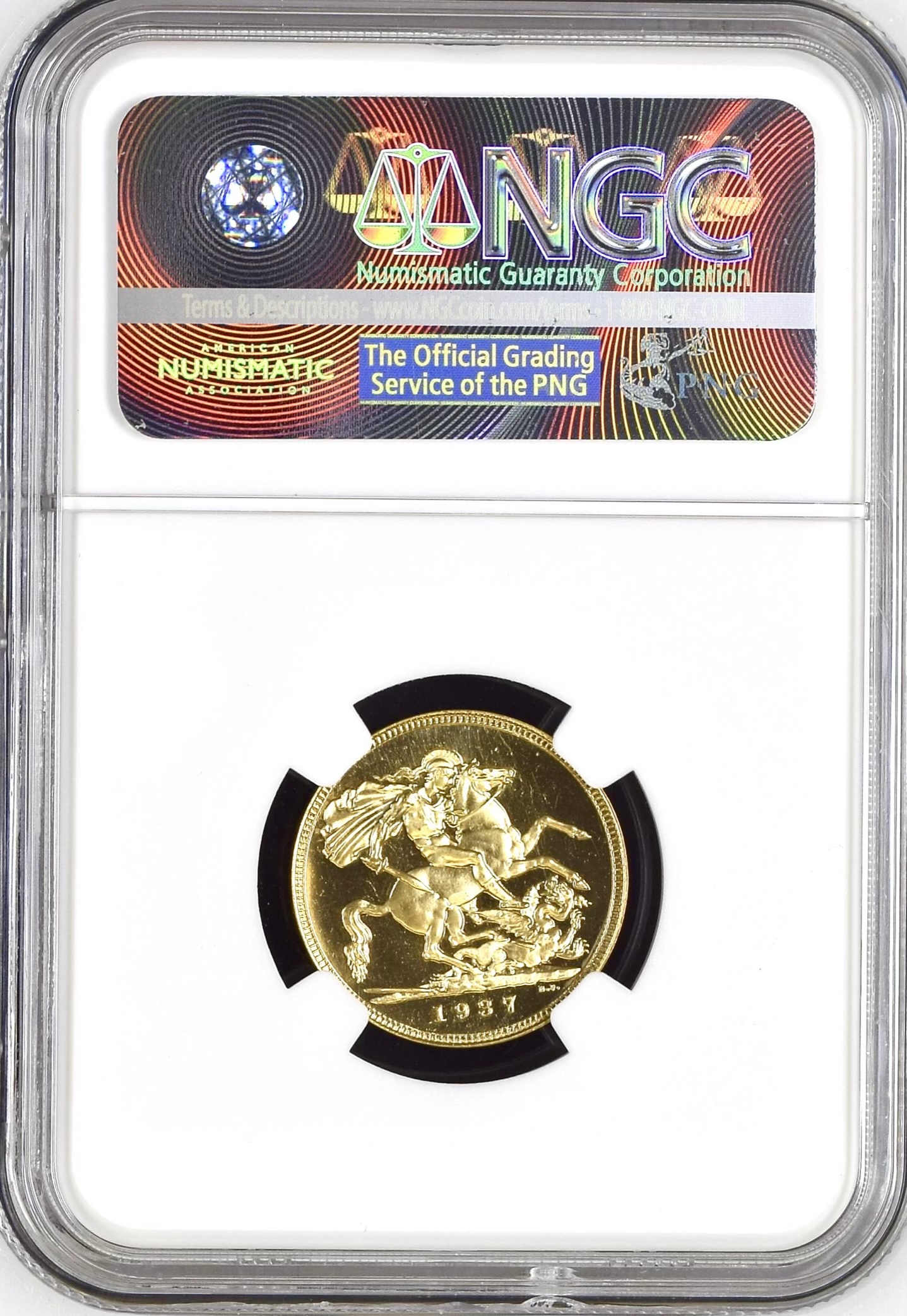 Reverse: St George on horseback advancing to right wearing a helmet and cape and holding a sword; below horse, fallen dragon with lance in its side; below exergue line at right the artist's initials B.P. (Benedetto Pistrucci); in exergue, 1937. No mint mark.