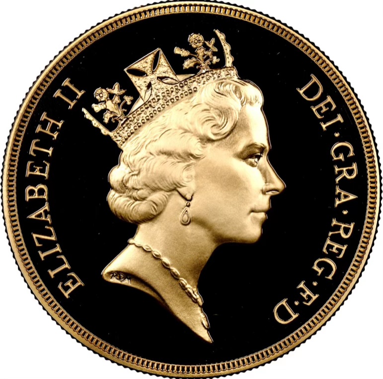 The obverse of the coin shows the crowned bust of Queen Elizabeth II, facing right (her effigy known as the "Third Portrait"). The Queen is wearing the royal diadem which she wears on her way to and from the State Opening of Parliament, a pearl necklace and earrings.