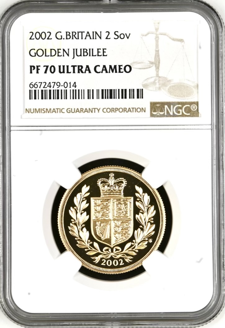 The 2002 double sovereign coins honour the Golden Jubilee (50th anniversary of the accession to the throne) of Queen Elizabeth II by reviving a modern version of a coin design last seen on half sovereigns of Queen Victoria in 1893. Instead of the renowned Benedetto Pistrucci engraving of St. George and the Dragon, the reverse of all 2002 gold sovereign denominations carries the Royal Coat of Arms for only the second time in 115 years. The only previous occasion was for the 500th anniversary of the sovereign coin in 1989.