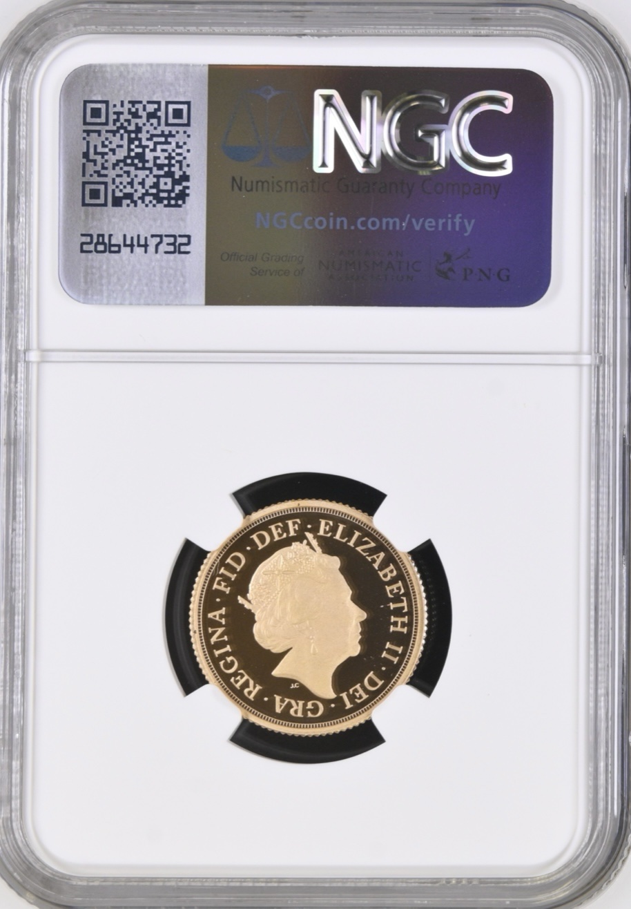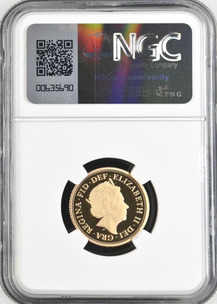 The obverse of the coin depicts the crowned old head of Queen Elizabeth II facing right, wearing the Royal Diamond Diadem crown worn for her Coronation (her effigy known as the "Fifth Portrait").