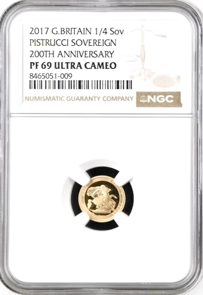 2017 Gold Proof Quarter Sovereign, NGC Graded PF69 Ultra Cameo. Pistrucci 200th Anniversary Special one year design.