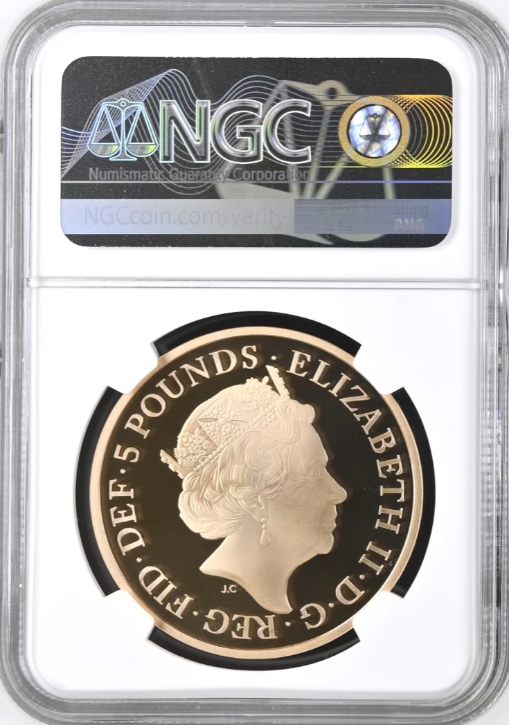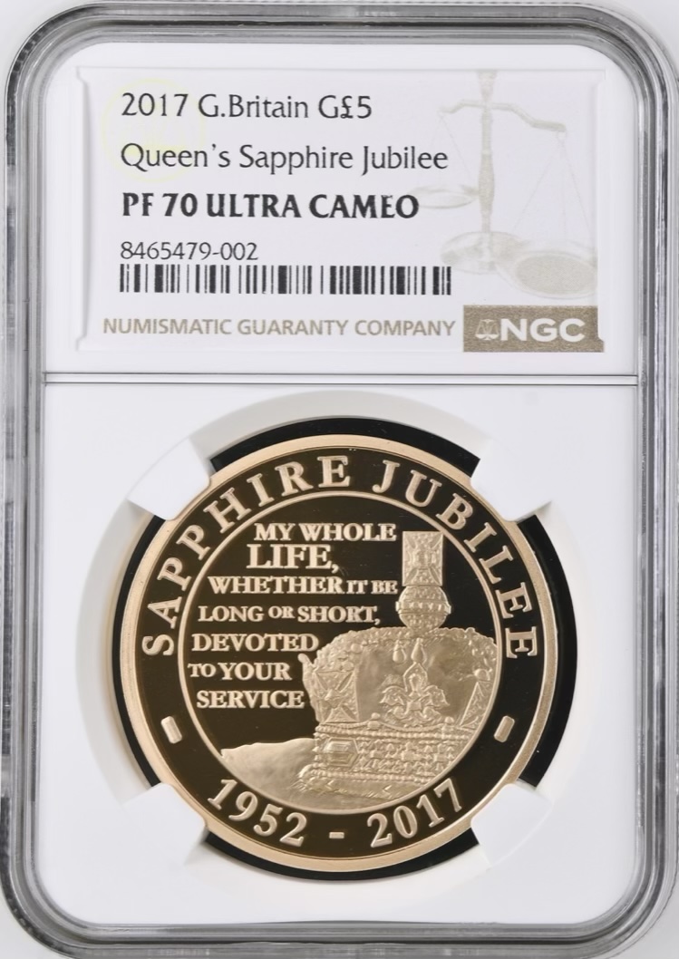 This commemorative £5 Crown-sized coin celebrates the Sapphire Jubilee (65th anniversary) of accession to the throne of Queen Elizabeth II.