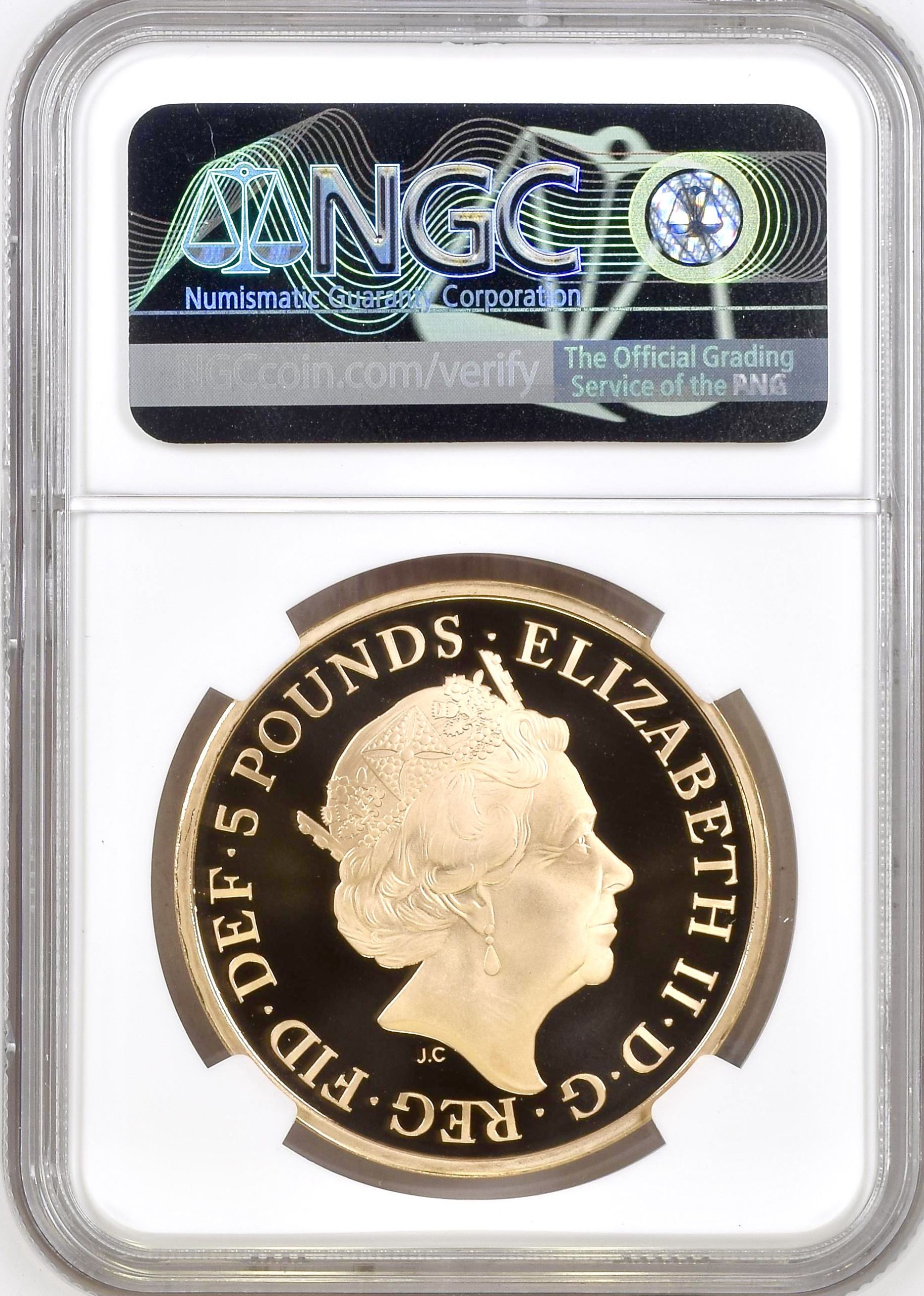 In small letters below the head, the artist's initials J.C (for Jody Clark). Running continuously around the effigy is the monarch's legend, followed by the date of issue and the face value: ELIZABETH II · D · G · REG · F · D · 5 POUNDS · 2021 ·. Translated from Latin: Elizabeth the Second, by the Grace of God, Queen, Defender of the Faith, followed by the value and denomination in English and the year.