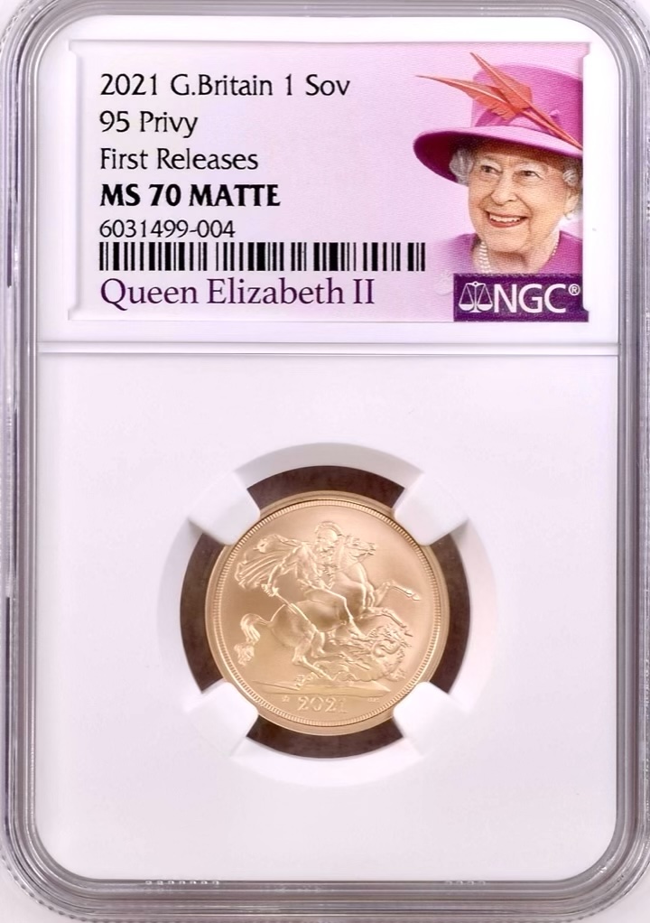 2021 Gold Sovereign Queen Elizabeth II 95th Birthday privy. NGC Top Graded MS70 Matte First Releases.