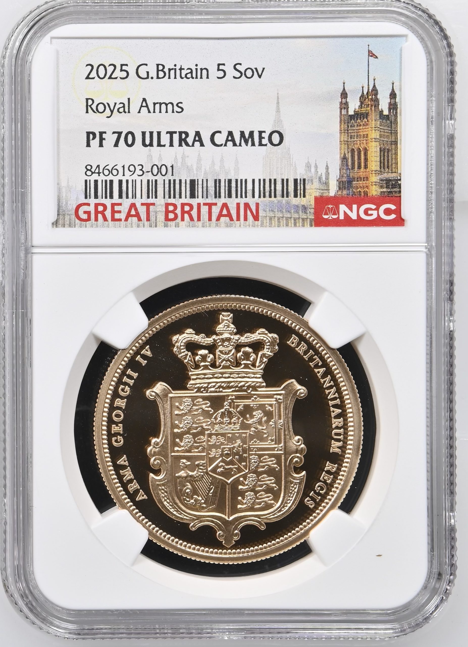 2025 Gold Proof Five Pounds Sovereign – Royal Arms – NGC Graded PF70 Ultra Cameo