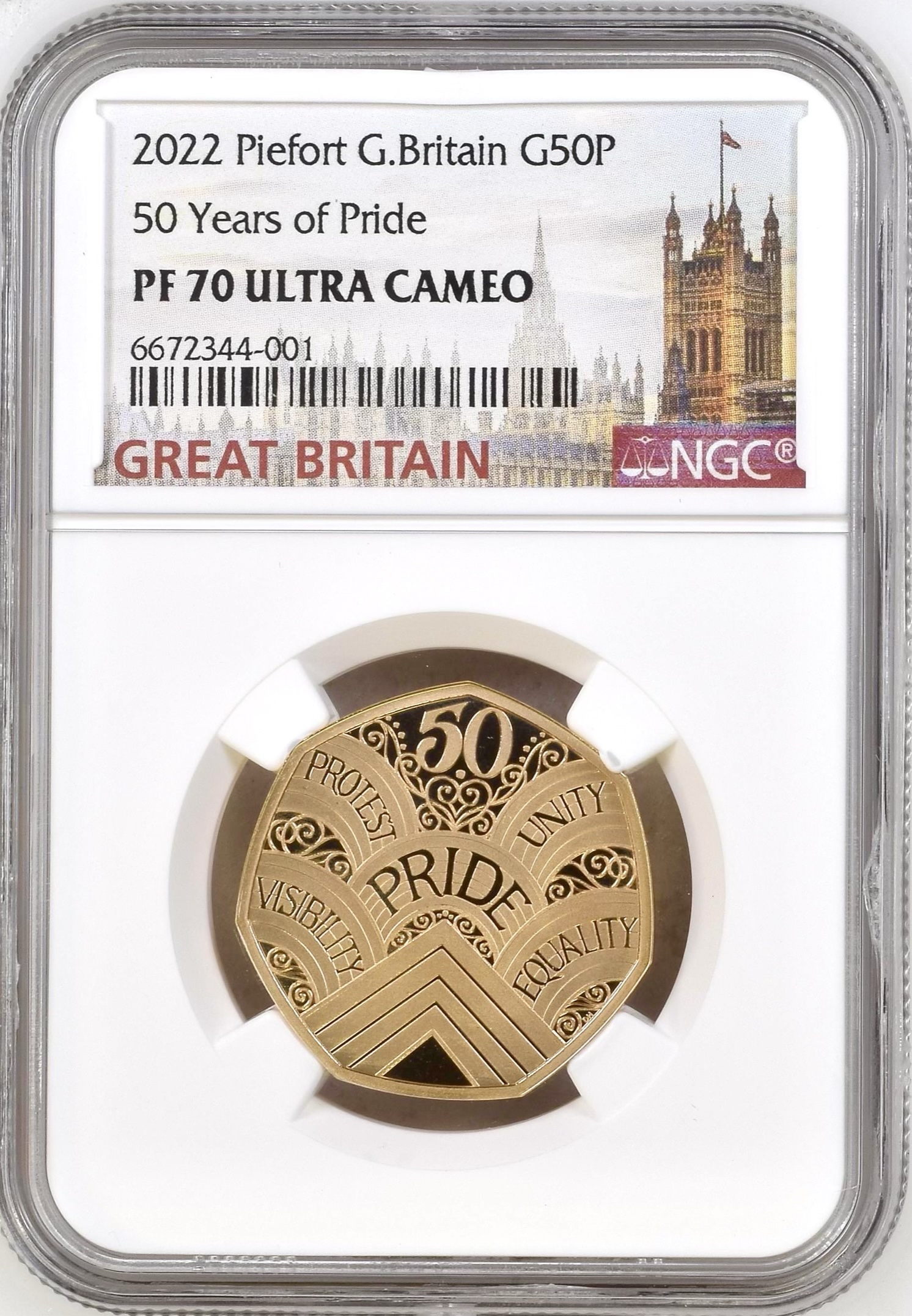 2022 Gold Proof Fifty Pence (50p) Piedfort, 50 Years of Pride. NGC Graded PF70 Ultra Cameo (SINGLE FINEST)