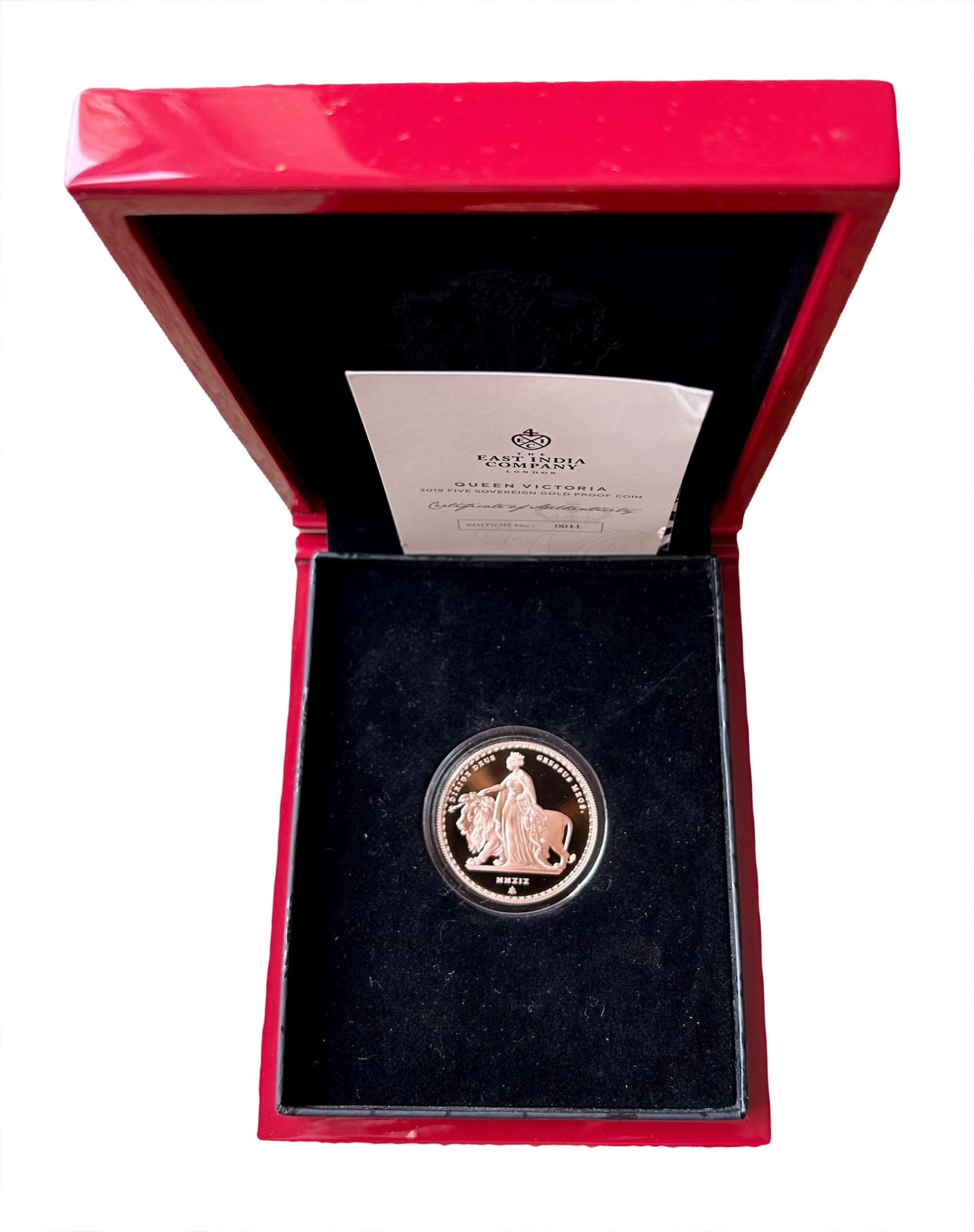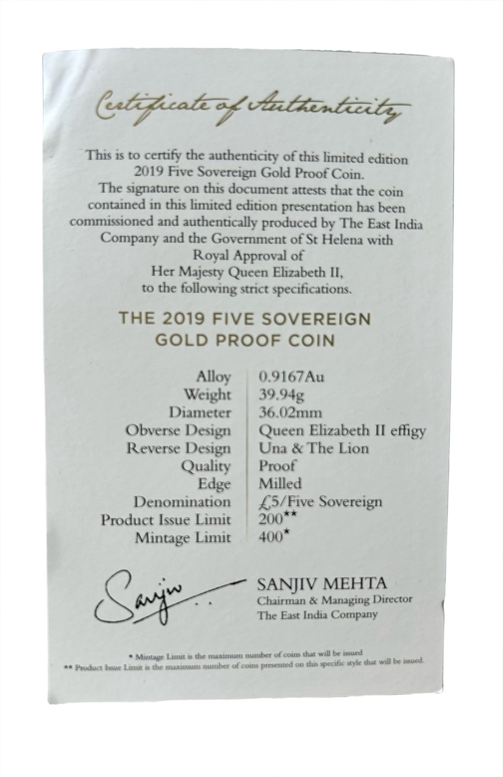 2019 East India Mint, St Helena Una And The Lion Gold Proof £5 Coin.