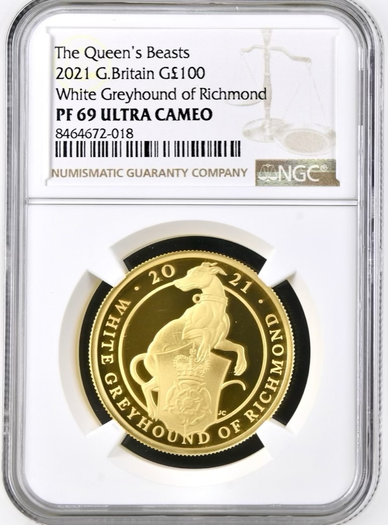 2021 White Greyhound of Richmond Gold Proof £100 – Queens Beast One Ounce Coin – NGC Graded PF69 UCAM